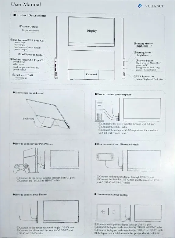 VCHANCE 16 Inch Oled 4K UHD Touch Screen Portable Monitor 100%DCI-P3 HDR Expand Office Display for PC Laptop Phone XBox Switch